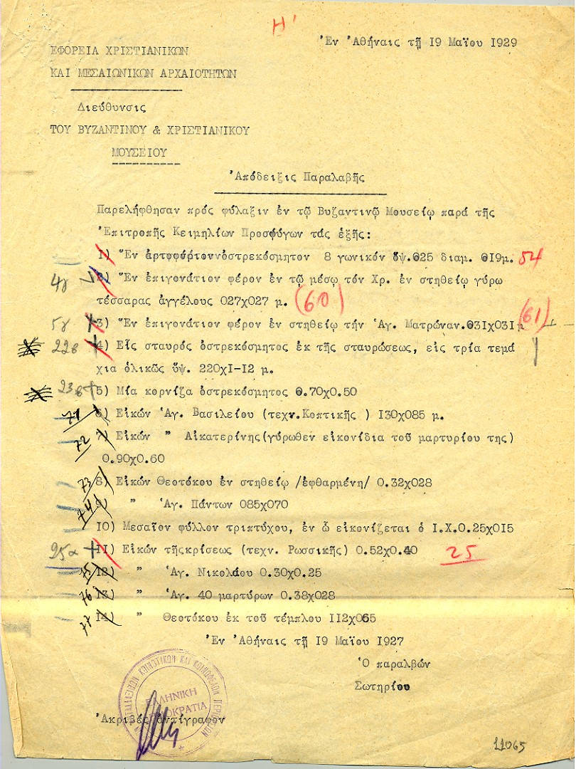 Ο Γεώργιος Σωτηρίου παρέλαβε την εικόνα με απόδειξη από την Επιτροπή Κειμηλίων Μικράς Ασίας στις 19 Μαΐου 1927 και την εξέθεσε το 1930 στην αριστερή πτέρυγα της αυλής της «Βίλας Ιλίσια», στον τοίχο αίθουσας, στον οποίο είχε συγκεντρώσει δείγματα «Ξένης Μεσαιωνικής Αγιογραφίας». Παρέμεινε εκεί έως τη δεκαετία του 1990, όταν ο χώρος αυτός έπαψε να είναι εκθεσιακός. Μεταφέρθηκε στην αποθήκη, και από εκεί, το 2010, στη νέα μόνιμη έκθεση. Πρόκειται για μία από τις πέντε ρωσικές εικόνες που φυλάσσονται ως προσφυγικά κειμήλια στο Βυζαντινό και Χριστιανικό Μουσείο.