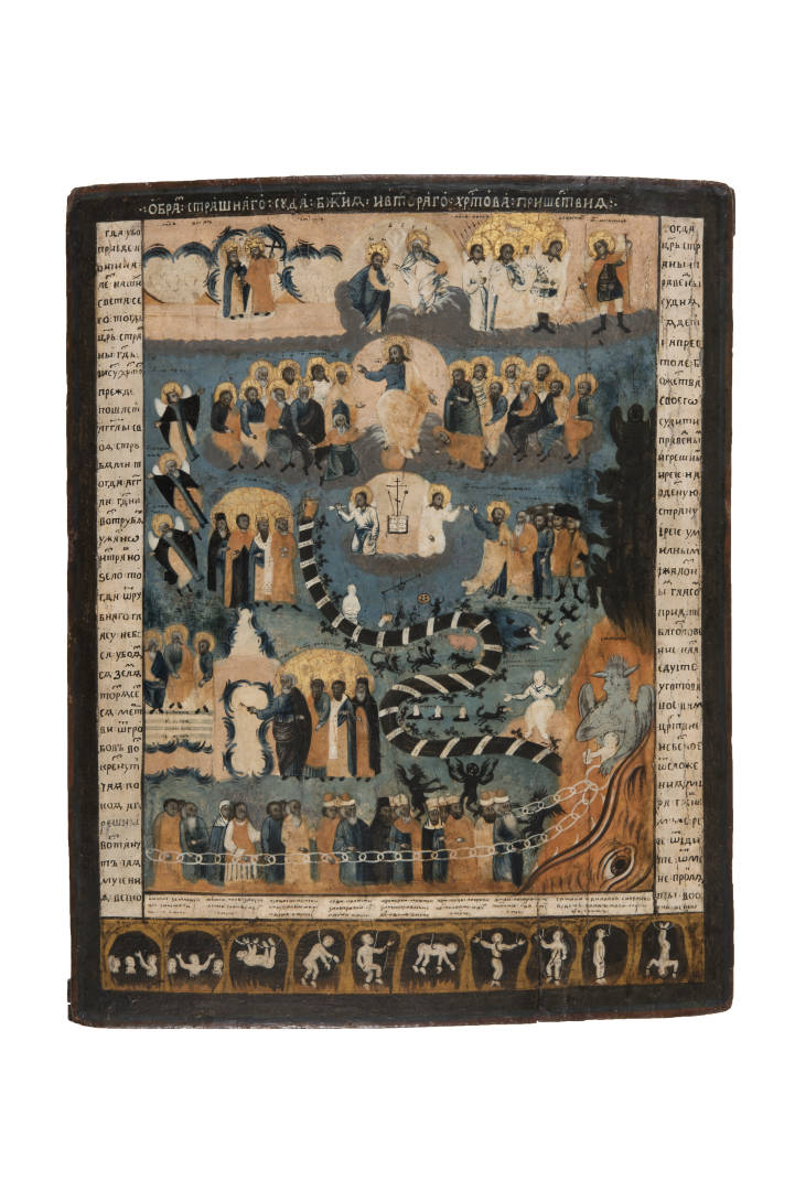 Σύμφωνα με την κυριλλική επιγραφή στο πάνω περιθώριο, πρόκειται για Εικόνα της Τελικής Κρίσης του Θεού και της Δευτέρας Παρουσίας του Χριστού. Στο πάνω μέρος της παράστασης βλέπουμε τις επουράνιες δυνάμεις να προετοιμάζονται για το φοβερό γεγονός: στο κέντρο ο Πατήρ ευλογεί τον Υιό, αριστερά οι άγιοι Κωνσταντίνος και Ελένη συνομιλούν μεταξύ τους, δεξιά ο αρχάγγελος Μιχαήλ ενημερώνει τα αγγελικά τάγματα. Στο κύριο τμήμα της παράστασης εικονίζεται ο Χριστός μέσα σε Δόξα ανάμεσα στην Θεοτόκο και τον Πρόδρομο. Στα πόδια Του εικονίζονται ο Αδάμ και η Εύα, ενώ παραπλεύρως και παρακάτω Απόστολοι και διάφοροι άγιοι. Κάτω από τον Χριστό ο Σταυρός και τα σύμβολα του Πάθους μεταξύ δύο αγγέλων, και αμέσως πιο κάτω διενεργείται η ψυχοστασία. Ένα μακρύ φίδι με το κεφάλι του στα πόδια του Αδάμ και την ουρά του στα έγκατα του Άδη φέρει στο σώμα του επιγραφές που αναφέρουν τα αμαρτήματα των κρινόμενων. Στα αριστερά του φιδιού ο Απόστολος Πέτρος ξεκλειδώνει την πύλη του Παραδείσου για τους δίκαιους, οι οποίοι εισέρχονται κι έπειτα ανέρχονται προς τους ουρανούς. Στα δεξιά του φιδιού ο Απόστολος Παύλος ωθεί τους αμαρτωλούς προς τον Άδη δείχνοντάς τους τον Κριτή. Το βασίλειο του Άδη καταλαμβάνει το δεξί άκρο και όλο το κάτω μέρος της παράστασης. Στο κάτω μέρος οι αμαρτωλοί σε σειρά, δεμένοι με αλυσίδες, οδηγούνται στο στόμα της Κόλασης, ενώ ακριβώς από κάτω, στην κατώτερη ζώνη της εικόνας, αναπτύσσονται σκηνές των κολασμών στους οποίους υποβάλλονται. Η όλη παράσταση περιβάλλεται από διδακτικά και επεξηγηματικά κείμενα, όλα σε κυριλλική γραφή.