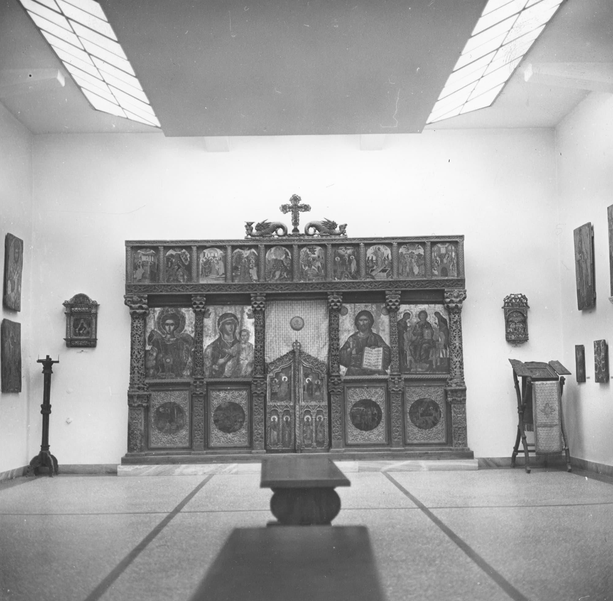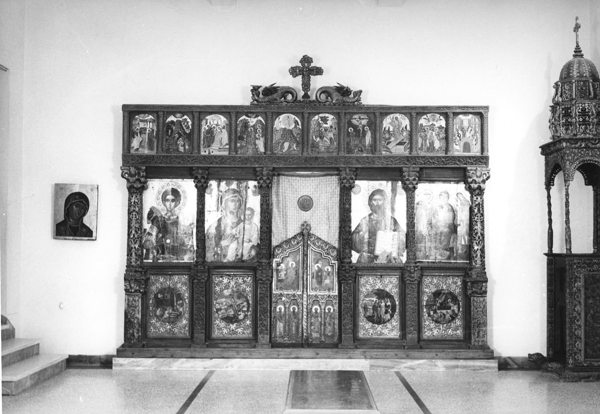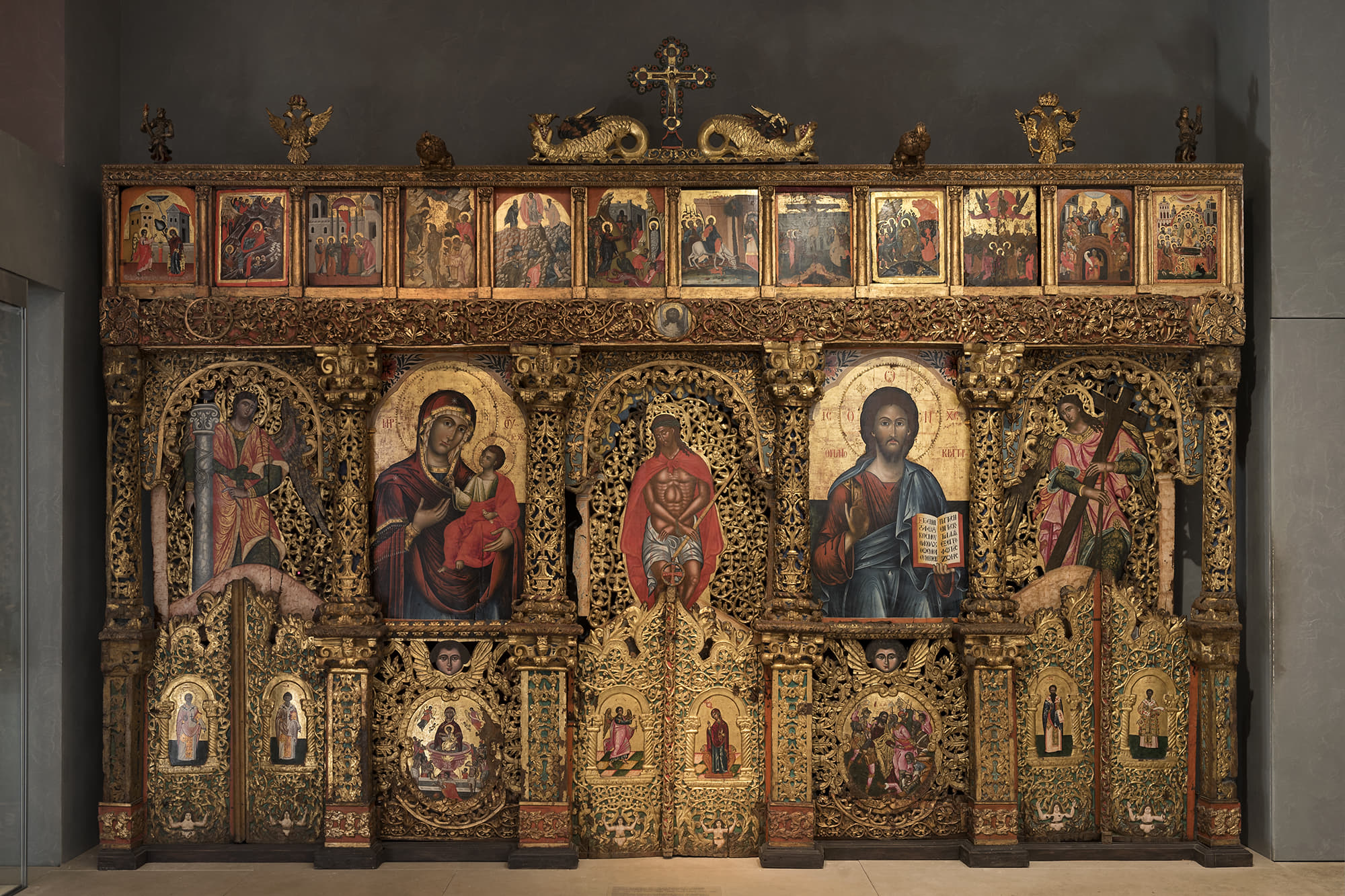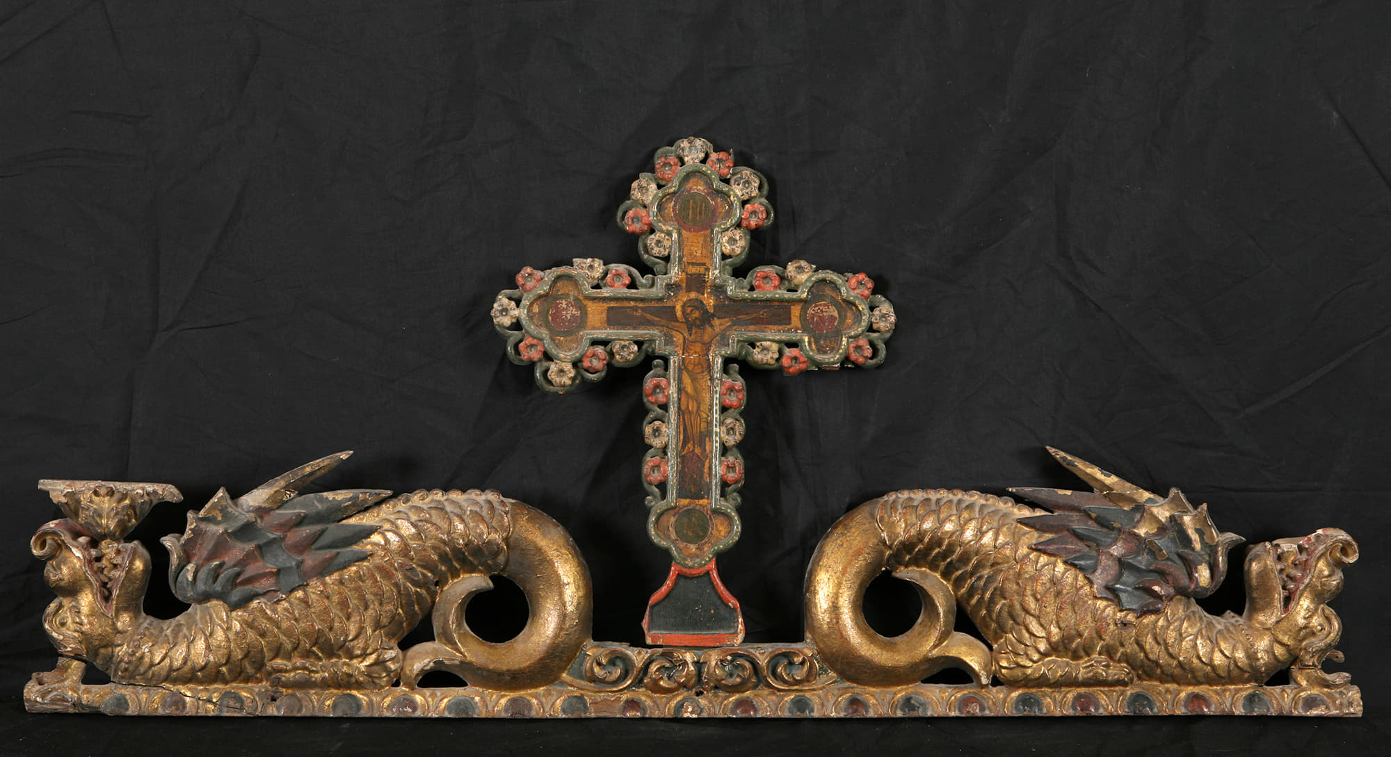 Ξυλόγλυπτη επίστεψη τέμπλου με Εσταυρωμένο και δράκοντες.